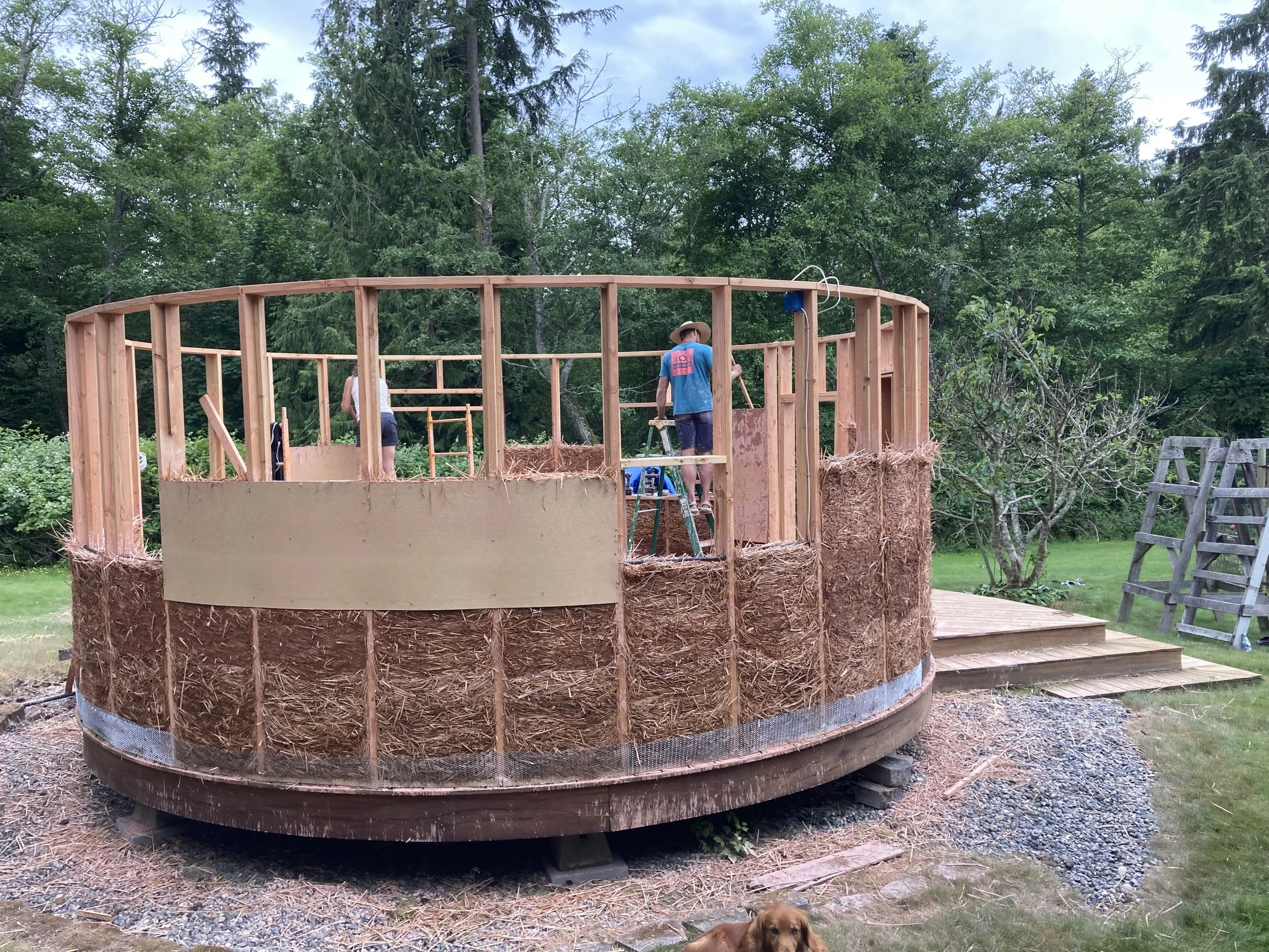 Load bearing straw bale. Earthen plaster inside and out, earthen floor. Built over a three month period in 2003. No cracks, no settling, no mold or mildew. Awesome!