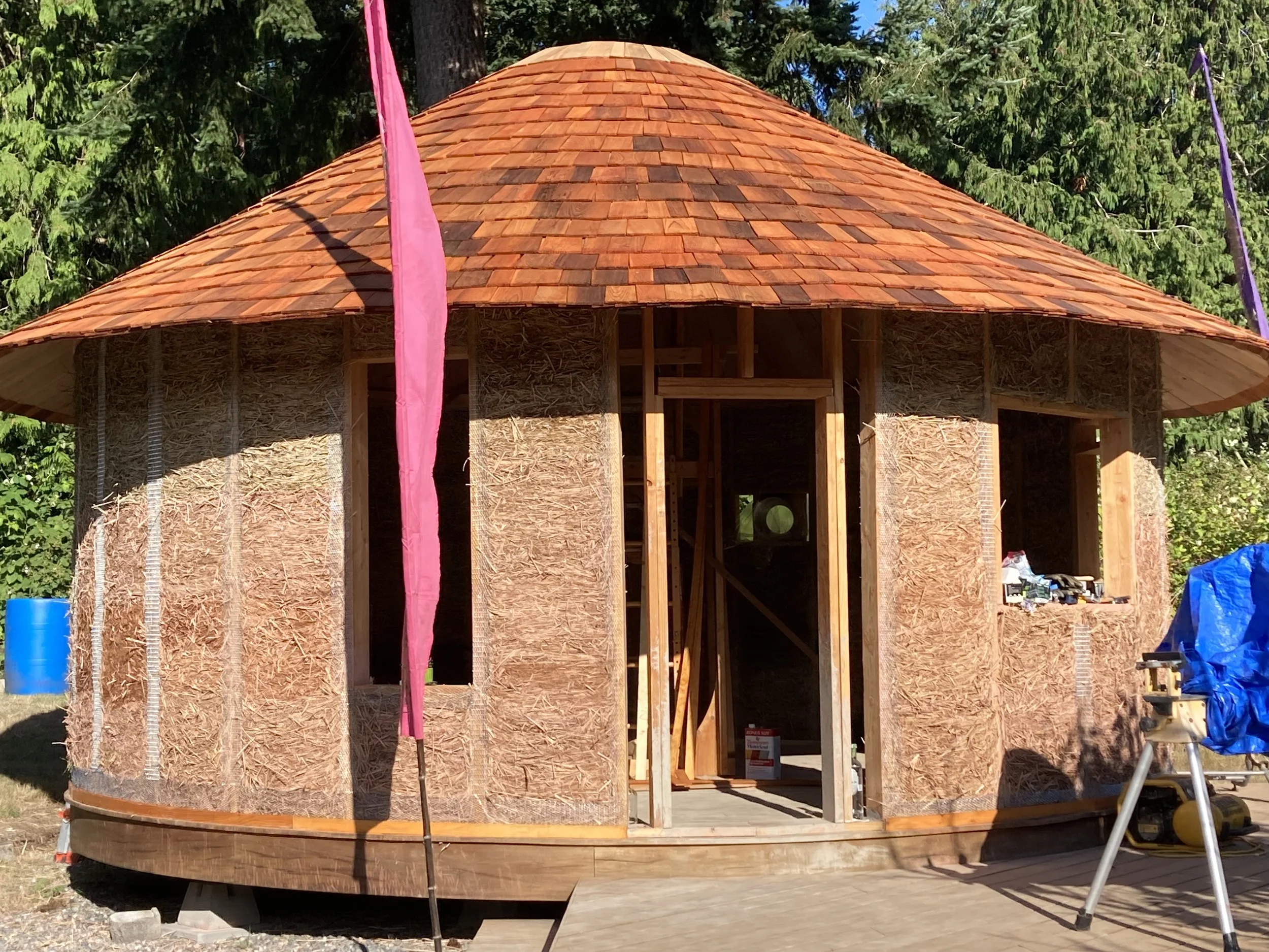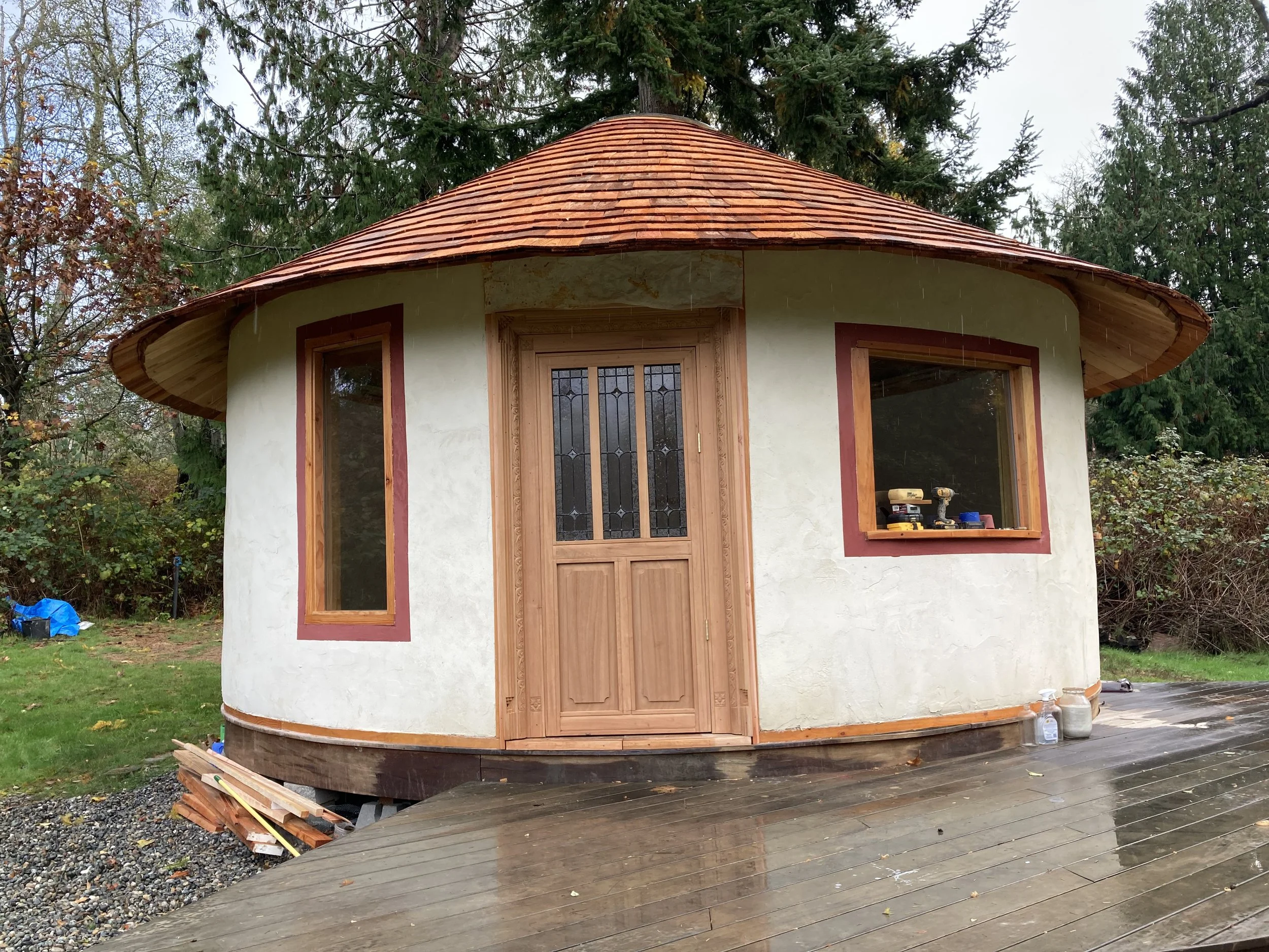 Cob Meditation sanctuary. Sunrise windows. Finished roof, finished plaster.